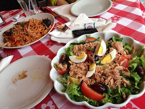 從住的地方走到維諾納的競技場廣場,也是最熱鬧的地方,大概20分左右吧超大的廣場周邊都是餐廳,我們因為中午沒吃加上想體驗廣場週邊的用餐感受,找了家桌巾順眼的就坐下來點餐,海鮮意大利麵跟尼斯沙拉搭配超大杯喝不完的汽水,吃了我們40歐歐買尬!