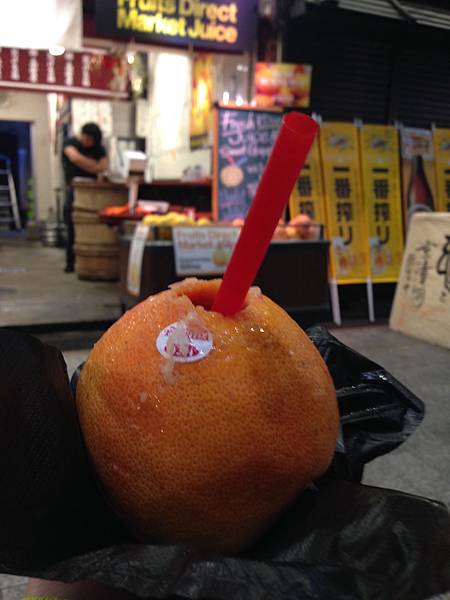 晃著晃著竟然來到錦市場,不知何時起,錦市場營業到傍晚,記得很久以前過了中午就開始黑摸摸一片,不過,日本人開始用觀光來拼經濟了我猜,很多商店都越來越晚關。既然來到錦市場,順便閒晃一下有甚麼新鮮,就看到了直接插著吸管的葡萄柚,老闆很有趣,還會說中文來吸引客人,原來是用特別的果汁機伸到葡萄柚裡面絞碎,就可以直接吃新鮮的葡萄柚汁,真是環保又健康啊!