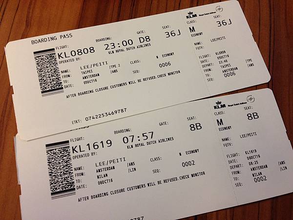 櫃檯給了兩段航程的機票(桃園-阿姆斯特丹,阿姆斯特丹-米蘭),沒有傳說中的轉機說明,我問了櫃檯,是說下機前會提醒說明,或到當地直接找登機口即可(?),嗯好吧,無論如何,後來旁邊坐了一個要去德國的台灣人,到時候至少可以跟他走XD.....感覺是神派來讓我安心的天使哩!Y(_)Y