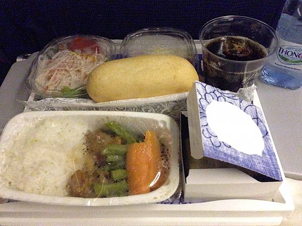 話說準時登機後(沒有網友遇到的機器故障、延誤,或颱風因素巴拉巴拉等等等),吹好枕頭靠墊們,準備來入睡,等著椅背可以躺下ㄟ發起小點心了?好吧要了杯水,聽著KPOPㄟ為何有食物的味道?不會吧半夜ㄧ點發什麼餐啊?宵夜嗎?這麼晚吃會肥捏;_A