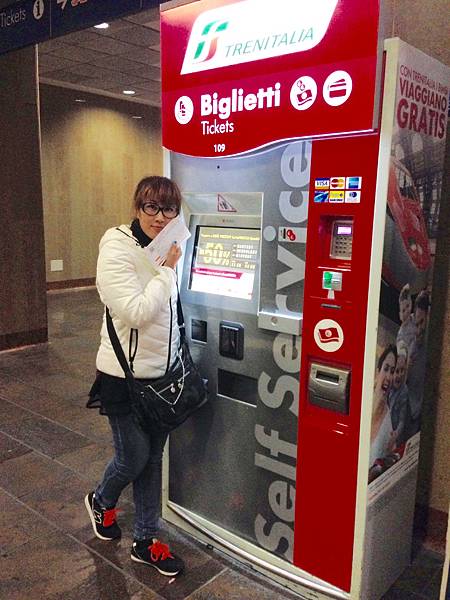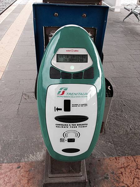 一到月台先找打票機,沒打過好興奮(神經),因為是便宜慢車,他不知等誰晚了半小時才發車,我們已經很習慣西方人的悠閒了,反正不趕時間,威尼斯的旅館也是下午兩點才能checkin,算算到那再吃個飯剛好。