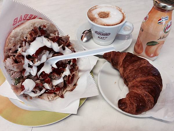 途徑印度人開的早餐店,點個帕尼尼加上老樣子可頌套餐(飲料+咖啡),兩個人的早餐就解決了;帕尼尼好澎湃,人家把肉倒在盤中然後邊咬麵包邊配,我們是用叉子先把肉挖了些吃到看到麵包才夾著吃,哈,果然又學到一招。