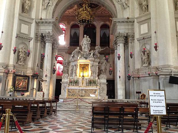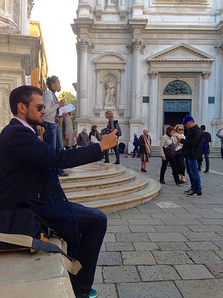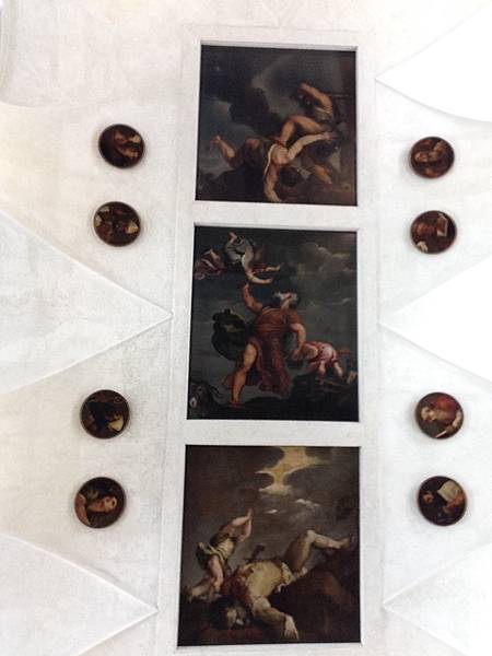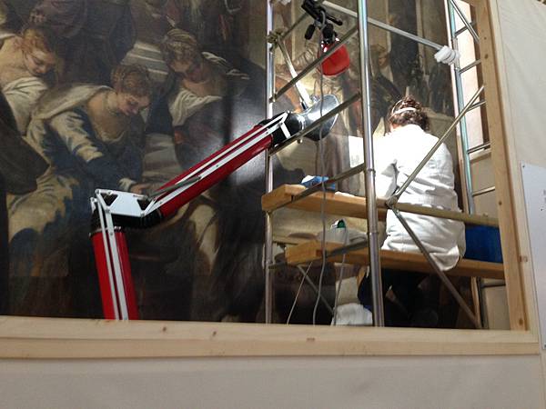 而旁邊的安康聖母院(可以說是威尼斯的鎮瀾宮,因為為了感想聖母停止了黑死病的肆虐而建造),裡面的丁托列多的最後晚餐也是重點之一,參觀室有放幾個化妝鏡在桌上,就是給遊客欣賞頂棚畫(以撒的犧牲、雅各與天使摔角、大衛與哥利亞)用的,但好像只有我們發現這件事,而透過鏡子觀賞,不僅脖子不會酸,畫作還特別明亮清楚,好神奇啊!丁托列多最後的晚餐在修復中,我偷偷拍了修復員的身影(裡面不可拍照),近距離觀賞人修復油畫真的很神奇,看他一直用油擦拭污漬,揪搞剛欸