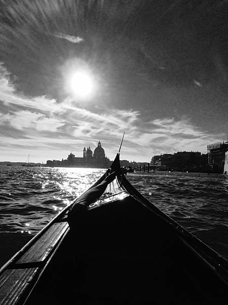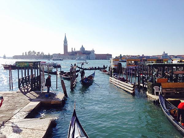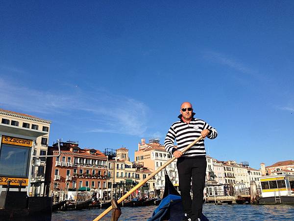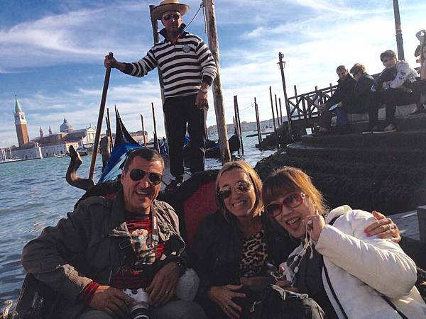 我一直在掙扎要不要搭貢多拉,因為每天搭船出海,貢多拉只是角度低點好像沒什麼差別,可不搭嘛好像沒來威尼斯,今天又沒風,豔陽高照的好天好適合,於是開始左看右看地想找人一起合搭,一艘80歐,最多6人。看到一對夫婦跟老爸爸好像在研究,一直躊躇要不要上前詢問,結果人家一家三口就上船了囧。我們又繼續在碼頭左顧右盼地觀察誰要搭船,中國大媽想搭嘛?什麼?10分後集合囧,瞧著瞧著,一對中年夫婦好像有意思,一直在看船價,於是我鼓起勇氣上前問,他們果然非常想share,說一艘80太貴了,但我們要share的意圖被船夫聽到開價100,先生說走遠點再跟別的船夫說我們是朋友,倫敦或什麼地方認識的朋友之類的,哈超開心。原來他們來自西班牙的巴賽隆那,真是熱情國度,人也非常nice,其實旅途上都遇到很好的人幫助,真的好感謝主喔!