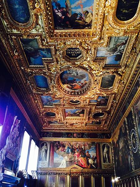 總督宮內的每間客室都非常驚人,畫是拿來當壁紙鋪的,很奢華的生活,當年威尼斯商人很會賺,總督油水一定更多!