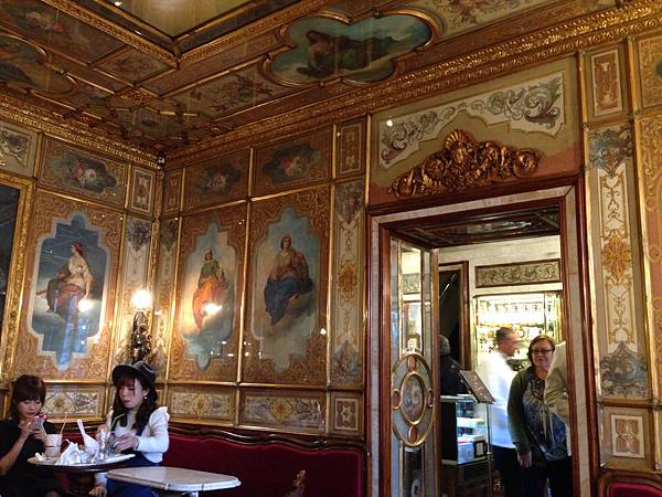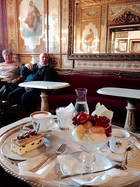 花神咖啡歷史悠久,是過去威尼斯貴族社交場所,所以裝潢也是跟總督宮類似(都是畫),沒在看價錢只叫自己愛吃的,這感覺好幸福啊!(我真的伙食費估太多)但還是真貴,坐下就7.5歐,外面喝更貴,外面風大就不出去了,反正這幾天常坐外面廣場吃東西。