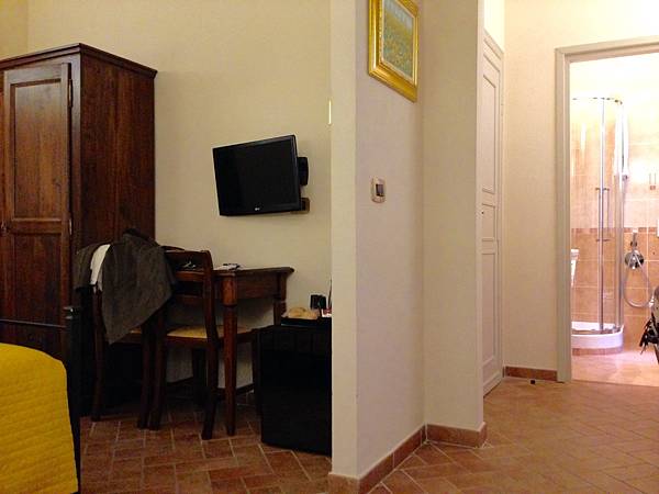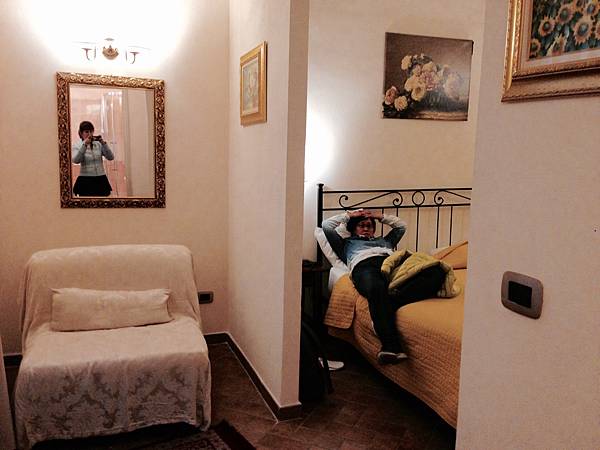 佛羅倫斯的這家旅館是所有住宿裡面最美最享受的,可價錢卻很便宜,一晚才50幾歐,有冰箱、早餐可頌+果汁、紅茶咖啡包、兩瓶礦泉水,電視、書桌、沙發、行李架衛浴用品也應有盡有(牙刷牙膏沒),外面也有咖啡販賣機,老爺爺英文不好但人很好,checkin時就說房間跟照片一樣漂亮喔,果然沒錯!沙發跟床之間還有隔間咧床也是非常舒服,很慶幸此行的床都還不錯睡(除了威尼斯差強人意),近年旅行很怕睡不好就沒精神玩呢!