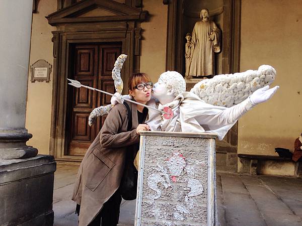 門口還有街頭藝人,挑了一個可愛的丘比特跟他拍照,他真的很盡責在娛樂大家,相對隔壁真把自己當雕像的,就沒甚麼生意XD,廊下跟西門町一樣還有很多可以用各種畫風幫你畫自畫像的,或是托斯卡尼景色的創作畫作,有些破格的畫法還滿有意思,要不是考慮如何帶回家的問題,是有想買一張掛牆上說!