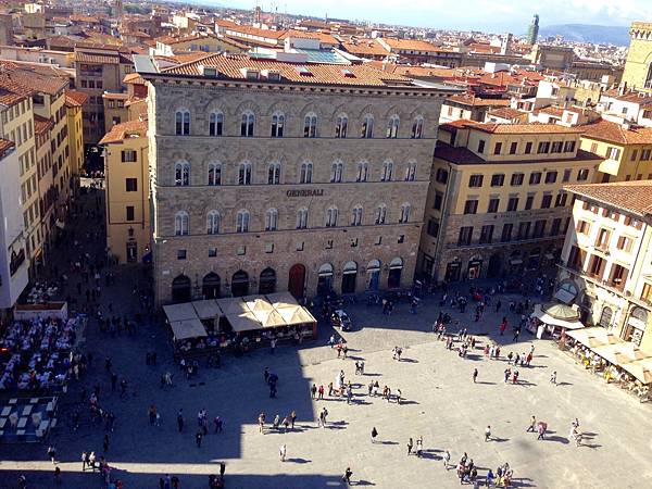 晃著晃著又到了共和廣場,說實在這廣場視覺上沒有很優,雖然一旁的傭兵涼廊算免費觀賞大師的雕像作品區,舊宮前的大衛像與大力士像滿足無法前往學院美術館看真跡的我們,可是跟菜市場一樣,遊客很多、鳥很多,建築物也髒髒的,怎麼拍都不好看!乾脆去找食物,因為不想走太遠,挑了一家很多人還有照片的餐廳,一樣選坐在外面的位置,高雅氣質阿北為我們服務,