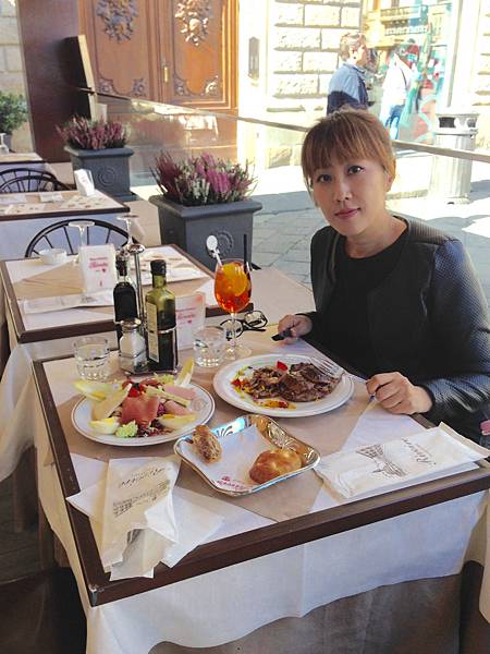 但義大利腔的英語真的有些難懂,所以本來以為點了可樂的我,卻送來一杯跟前幾天一樣的雞尾酒(挖哩咧),阿北你誤會我惹這樣一餐,史上最貴,一杯酒+沙拉+牛排+咖啡=60歐(喔媽媽咪呀)算惹,老娘來到歐洲,別的地方也花不了甚麼錢,在吃飯上就當凱子也沒甚麼!