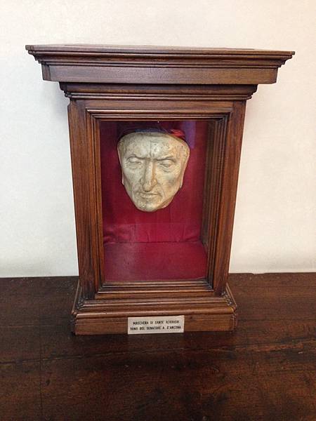 再往上走經過走廊,就看到靈魂人物但丁的死亡面具,果然非常哀傷,對於無法回到最愛的故鄉這種怨恨,是否也挹注在這面具上了呢?!