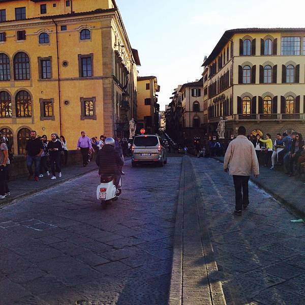 過了橋其實還有得逛,看到一家店裡的靴子很喜歡,價錢也還好,只是差一點就可以退稅這件事反而讓我有點不想買,而且一想到頗重的行李就更為難,最後還是放棄了,就這樣走到碧堤宮,坐在外面廣場掙扎著要不要進去參觀這文藝復興代表作波波利花園,網路上說很大得挑著部分看,而且已經下午四點多了,好像無法好好看完,LOLO又喊腳累(真的是很OOXX),我們只好坐在廣場跟其他人一樣曬太陽繼續掙扎(XD),然後旁邊的大嬸要求幫他跟狗拍照,還要戴墨鏡也來一張,全世界都很愛自拍呀!!
