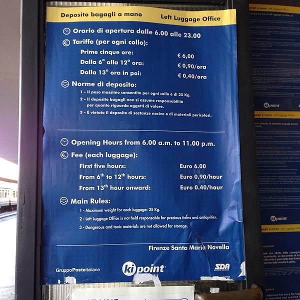 夕陽西下,又到了找中餐廳的時間,在車站附近晃到一家隊長餐廳,單價便宜又好吃,應該早要來這吃的,在義大利找中餐廳真的粉好找說!一邊吃一邊考慮著第二天寄存行李的問題,因為往米蘭火車是下午一點,退房時間是早上十點,如果出去又回住宿的地方拿行李,有點麻煩,再加上,除了那天入住的時候有看到老爺爺,其他時間都不在耶我們行李要寄放哪呢?因此就想說放在車站,上網問了朋友找到車站寄存的地方跑去一看,5小時6歐,我們兩個行李就12歐,等於拿錢來換懶惰(歪腰)......